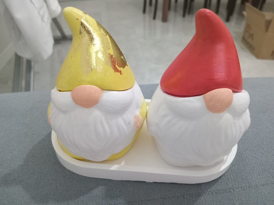Beyaz sakallı iki bahçe cücesi figürü, biri altın detaylı sarı şapka diğeri kırmızı şapka takıyor, beyaz taban üzerinde sergileniyor.