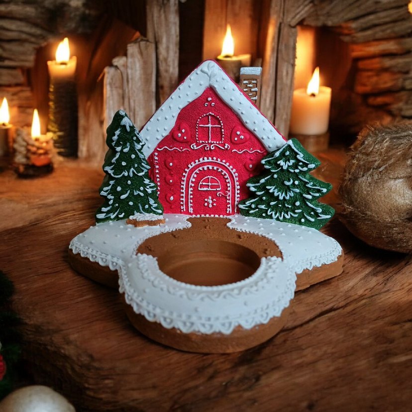 Kırmızı Noel evi şeklinde, yeşil ağaçlar ve beyaz kar detaylarıyla renkli bir figürlü mumluk. 11.5*11 cm polyester ve tasarım üründür. #mumluk #dekoratifmumluk #tealight Marka temsilidir