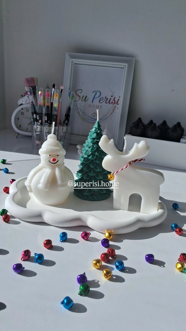 Beyaz renkte kar adam, çam ağacı ve geyik figürlü mumlar . Pastel tonlarda ve şık bir dekoratif set.