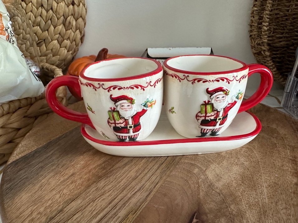 Kırmızı detaylı, renkli Noel baba figürlü kahve fincan yakımı görselde belirttim seramik oldugu için sır çaylak var ama belli olmuyor ve setamiklerde olabiliyor.