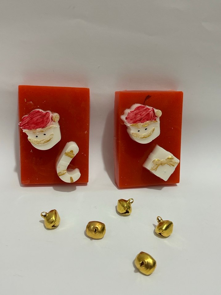 2 li set Noel temalı kırmızı sabunlar, üzerinde Noel Baba, şeker kamışı ve hediye figürleri bulunur. Küçük altın renkli çanlar eşlik eder.