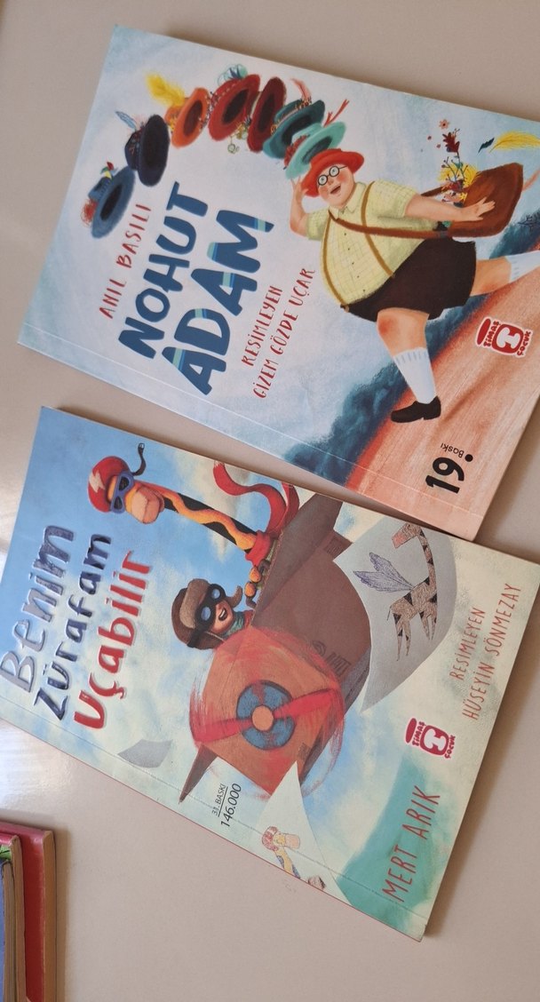 Renkli çizimlere sahip iki çocuk kitabı: Nuri Basili'nin "Nohut Adam"ı ve Ülkem Sönmezay'ın resimlediği "Benim Zürafam Uçabilir".