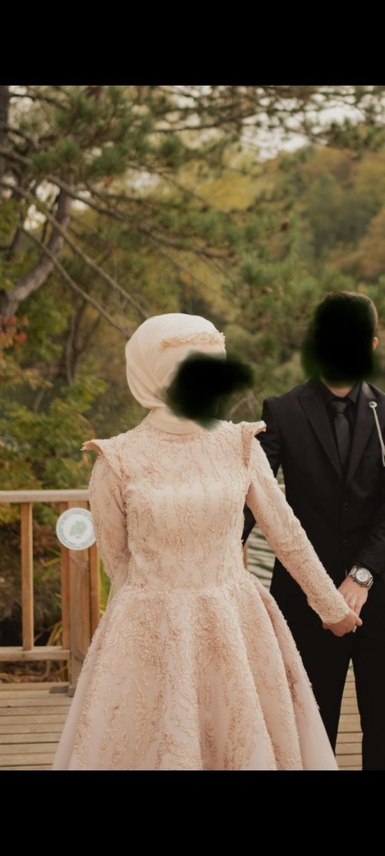 Nohut renginde, uzun kollu, drapeli ve yakalı bu nişan elbisesi, düzenli kesimiyle mütevazı ve gösterişli bir görünüm sunar. SADECE 2-3 SAAT GİYİLDİ, KURU TEMİZLEME YAPILMADI