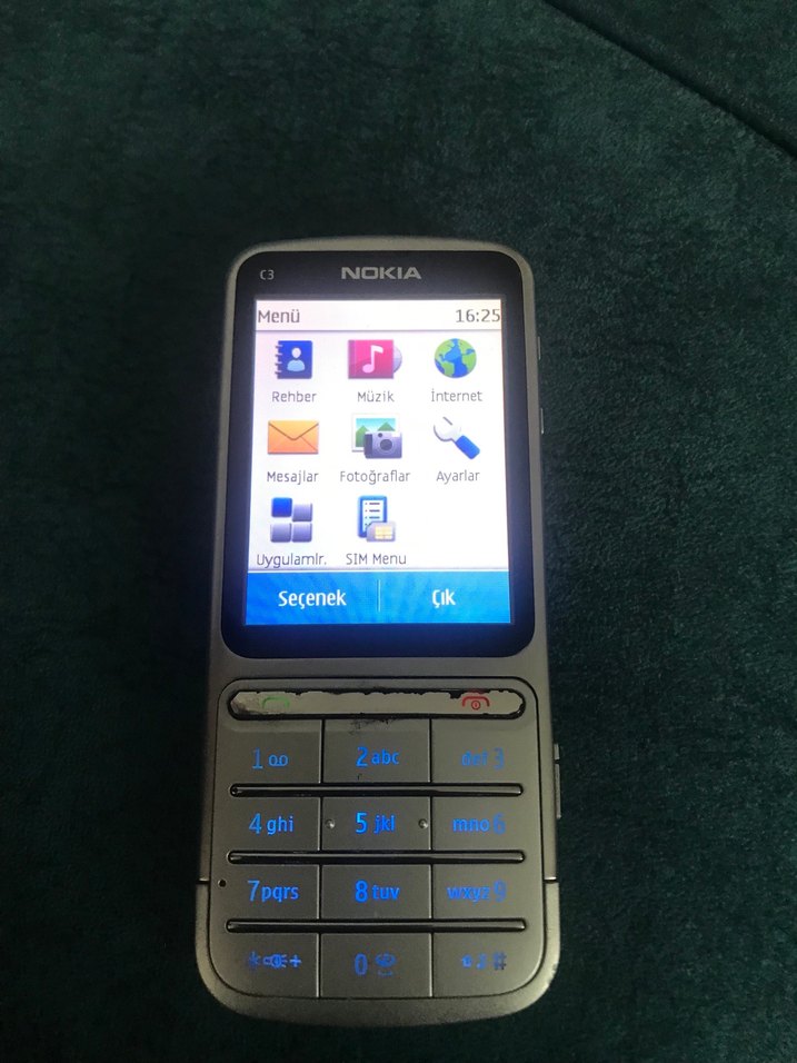 Nokia C3 koyu gri renkte, klasik tuş takımı ve aydınlatmalı tuşlarla birlikte menüde kişi rehberi, müzik, internet ve ayarlar seçenekleri bulunur.