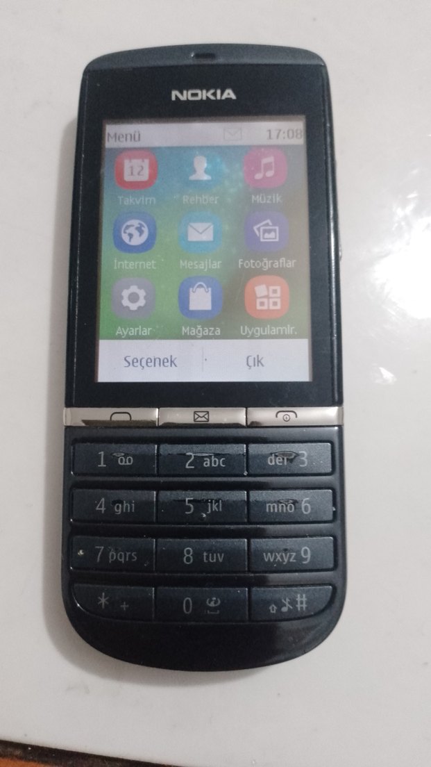 Klasik tuş takımı ve renkli ekranı olan siyah Nokia telefon. Takvim, rehber, müzik, internet, mesajlar ve fotoğraf uygulamaları bulunur.