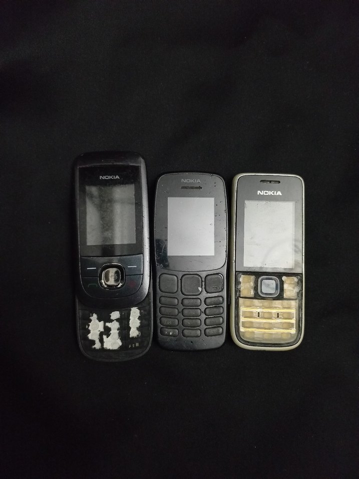 Üç adet eski model siyah Nokia telefon, cihazlar çalışıyor 1 adet batarya mevcut içinde tüm cihazlar aynı batarya ile çalışıyor fiyat üçü için geçerlidir koleksiyonerler için bire bir orijinal imei kayıtlı cihazlar asla kaçak değildir.