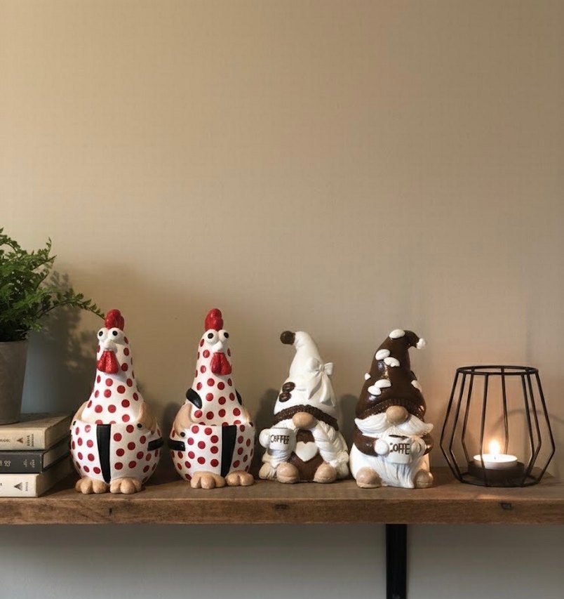 Beyaz ve koyu renkli, noktalı tavuklar ve kahve fincanı tutan cüce figürleri, dekorasyon için uygun. ☕