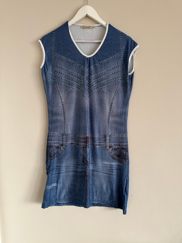 Mavi sandy kumaştan, v yaka ve kolsuz tasarıma sahip, lycralı rahat sokak stili için uygun mini elbise göğüs 50cm 70cm e kadar esneyebiliyor boy 90cm