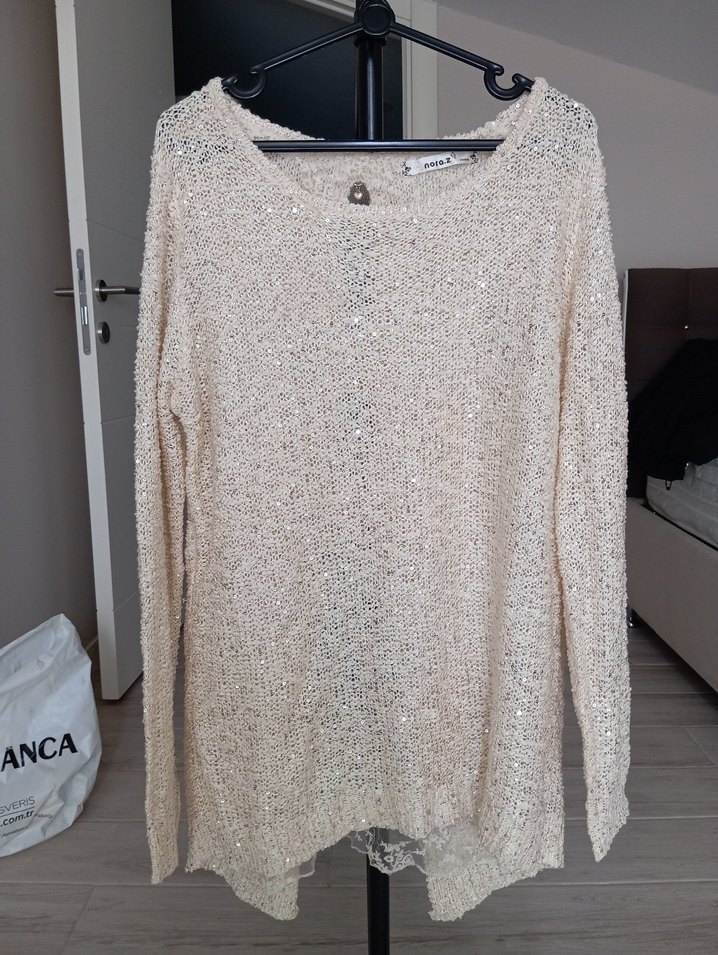 Kırık beyaz renkte, uzun kollu ve yuvarlak yakalı, rahat kesim triko kazak, günlük kullanıma uygun ve konforludur. Koltuk altı ölçüsü 53 Boy 70 cm dir.