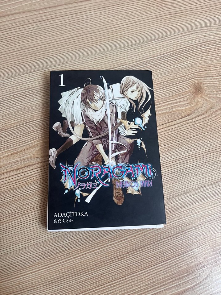 Noragami manga cilt 1, macera dolu karakterlerin yer aldığı kapakla. Kitap ADACITOKA imzalı ve başlık İngilizce-Japonca olarak mevcut.