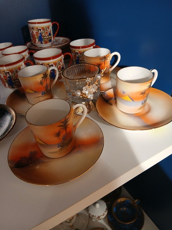 Kahverengi tonlarda tropikal palmiye desenli, pürüzsüz yüzeyli ve şık şekilli fincan ve tabak fiyatıdır.☕