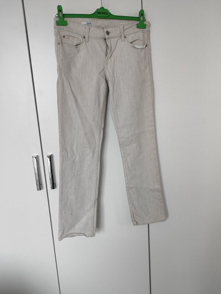 beyaza yakın gri renkte, normal kesim denim pantolon, rahat ve şık bir görünüm sunar. Günlük kullanıma uygundur, desensiz sade tasarıma sahiptir.