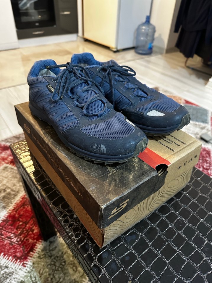 Lacivert erkek spor ayakkabılar, kauçuk tabanlı ve Velcro detaylıdır. Outdoor ve streetwear stiline uygun, rahat ve şık günlük ayakkabılar. Gore-tex North Face bot.