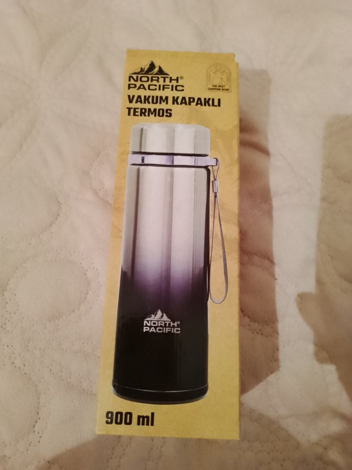 North Pacific termos 900 ml kapasiteye ve vakum kapaklı yapıya sahiptir. Koyu bej renk geçişli ve taşıma askılıdır.