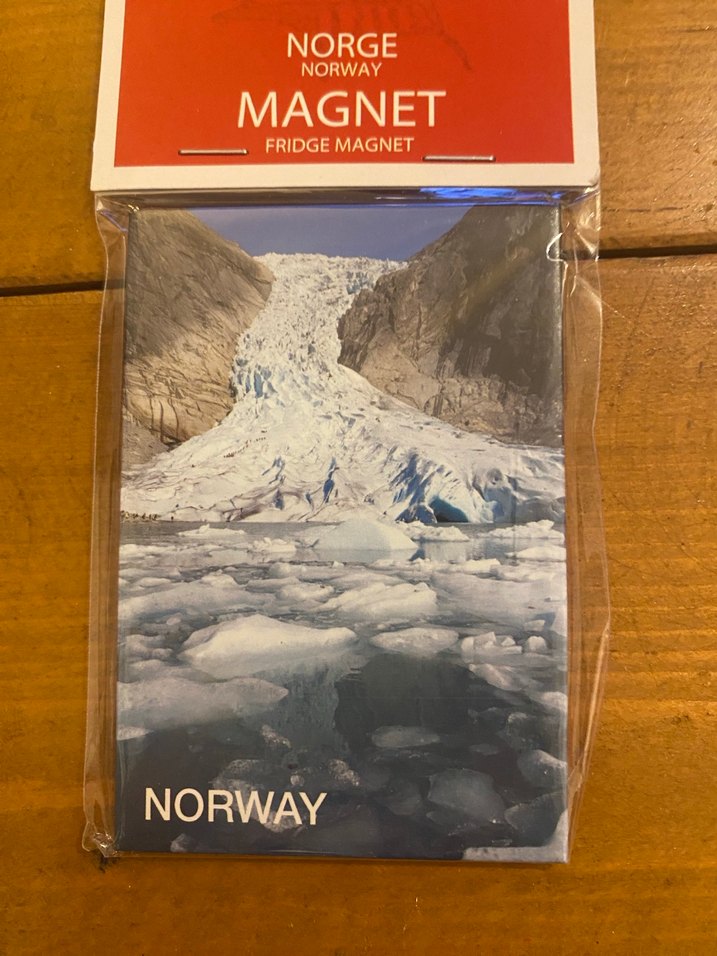 Bu buzdolabı magneti, Norveç'ten buzulu bir manzarayı gösterir ve soğuk mavi-beyaz tonlara sahiptir. Üzerinde Norveç ve Norge yazısı bulunur. ❄️