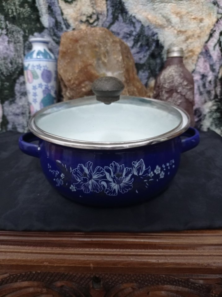 Koyu mavi renkte çiçek desenlerine sahip..ve cam kapaklı, nostalji ..havası olan dekorluk .ve kullanıma uygun emaye tencere