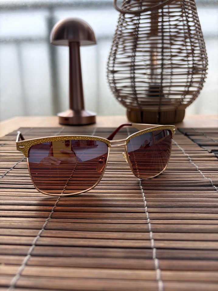 Nostalji retro havasını yansıtan güneş gözlüğü. Kahverengi cam ve gold detaylı çerçeveye sahip. ️