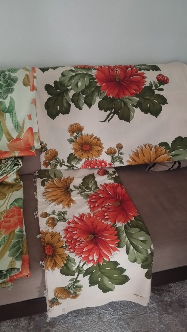 nostaljik Çiçek desenli, açık tonlarda çok renkli, büyük kırmızı, turuncu ve yeşil çiçeklerle süslenmiştir. kanat perde 4 adet mevcut