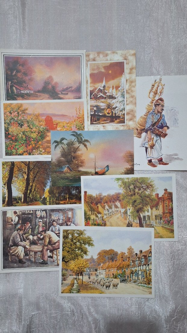 Peyzajlar, köy yaşamı ve kültürel figürler içeren çeşitli sanatsal sahneleri gösteren kartpostallar seti.