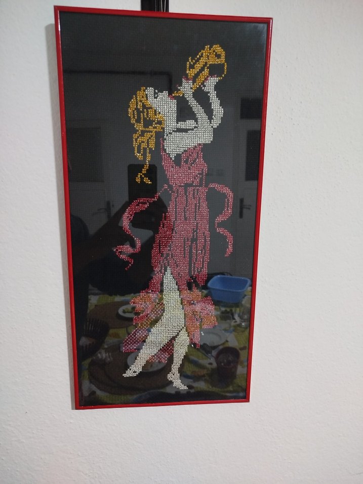 nostaljik Kırmızı elbiseli kadın figürünün siyah zeminde işlendiği, kırmızı çerçeveli kanaviçe tablo. Detaylı el işi nakış ile yapılmıştır.