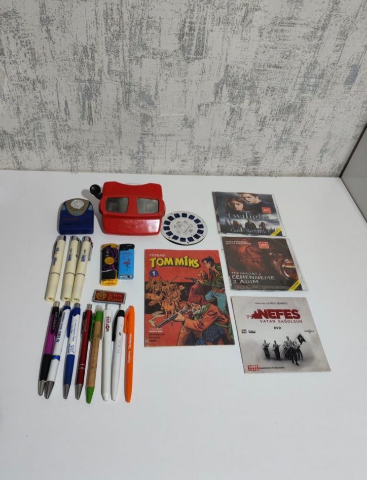 1990 lara yolculuk... -ÇİZGİ ROMAN ( TOMMİKS ) Promosyon KALEMLER ( Çoğu yazıyor) IŞIKLI PENLİGHT (3 Adet kılsız) 2 ADET IŞIKLI ÇAKMAK (GAZ YOK) NEFES FİLMİ VE 2 ADET CD FİLM (SIFIR , SORUNSUZ) HAC DÜRBÜN BAKINCA GÖRSEL GÖSTERİYOR (1 KASET HEDİYE) WALKMAN RADYO ( ÇALIŞIYOR) Gs Amblem