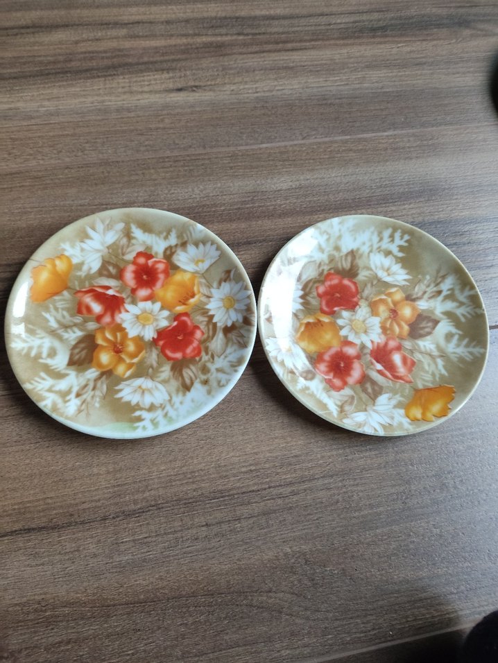 İki adet çiçek desenli bej tabak, kırmızı, sarı ve beyaz çiçeklerle süslenmiştir. Sofralarınıza renk katacak. nostaljik bir anı