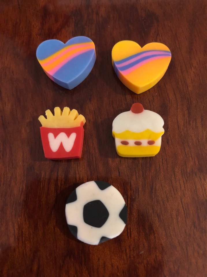Çocukluk yıllarımda alınmış ve genel anlamda kullanmaya kıyılamamış beş adet silgi. İki kalp, bir mc donalds benzeri patates kızartması, bir pasta, bir de bir miktar kullanılmış top. Silgi olarak performanslarını bilemiyorum o yüzden süs olarak kullanmak daha mantıklı olacaktır. Orijinal poşetleri yırtılmıştır bu yüzden yeni bir pakete koyulmuştur. Hem önlü hem arkalı fotoğraflanmıştır. Yıllara bağlı hafif lekeler mevcuttur.