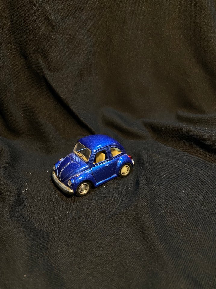 Detaylı tasarıma sahip parlak mavi oyuncak araba, bej iç döşemelidir. Oyun veya koleksiyon için uygundur.