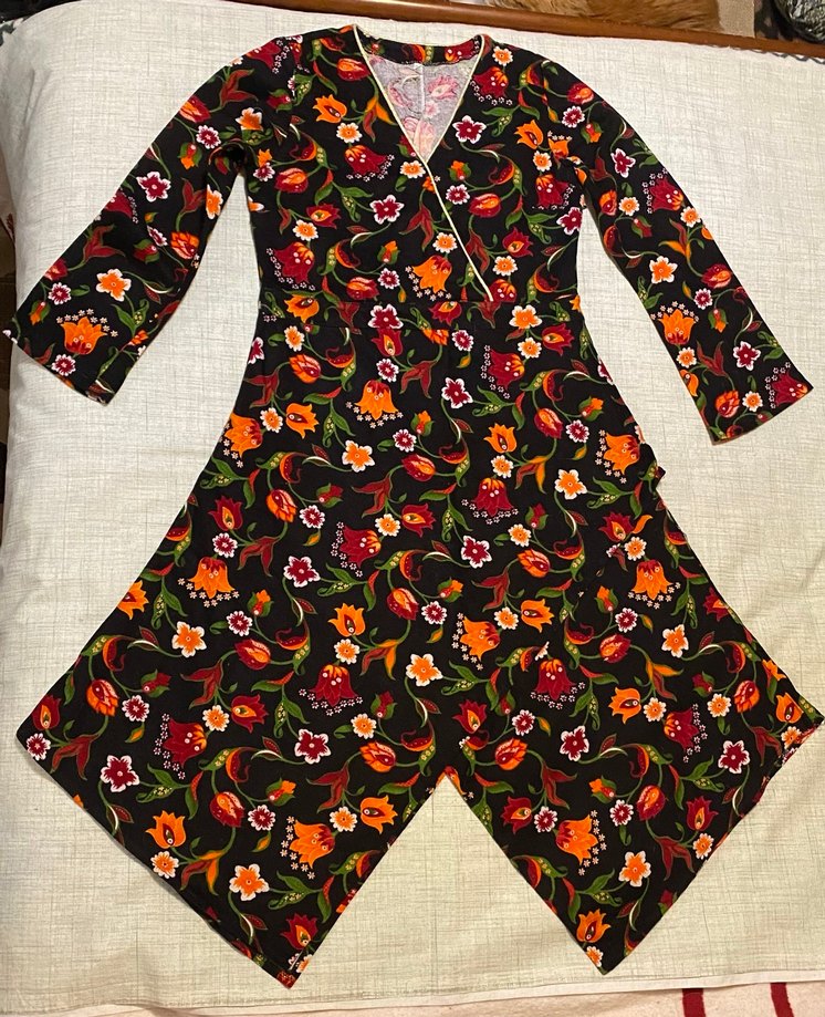 Anadolu çiçek motifleri desenli, pamuklu pazen kumaştan, asimetrik etekli, uzun kollu elbise. Kruvaze kapanan V yaka kenarında gold biye var, eteği çift kat ve asimetrik olarak birbirinin üstüne kapanıyor. Tam bir geleneksel-modern birleşimi olan özel bir elbise, yandan fermuarı da var. Yerel bir mağazadan alındı, sadece 1 kere özel bir gecede kullanıldı. 38-40 beden uyumlu, ölçüleri fotolarda mevcuttur.