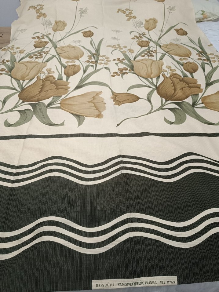 Kahverengi ve gri tonlarda çiçek desenli, alt kısmında dalgalı detaylar bulunan geleneksel tarzda perde.