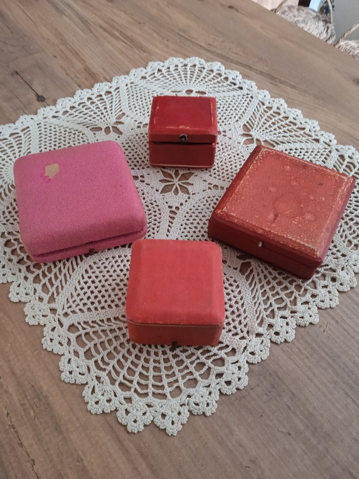Eski dönem dört adet takı kutusu. Muhtemelen 60'lı 70'li yıllara ait. Zaman içinde yıpranmaları olmuş. İster kolleksiyon ürünü olarak istenirse de takı kutusu olarak kullanılabilir. Büyük kutuların ölçüleri 8*9 cm, yükseklik 2.5 cm. Küçük kutuların ortalama 5,5 cm. Yükseklik 3 cm. Kusurları fotoğraflarda görünüyor.