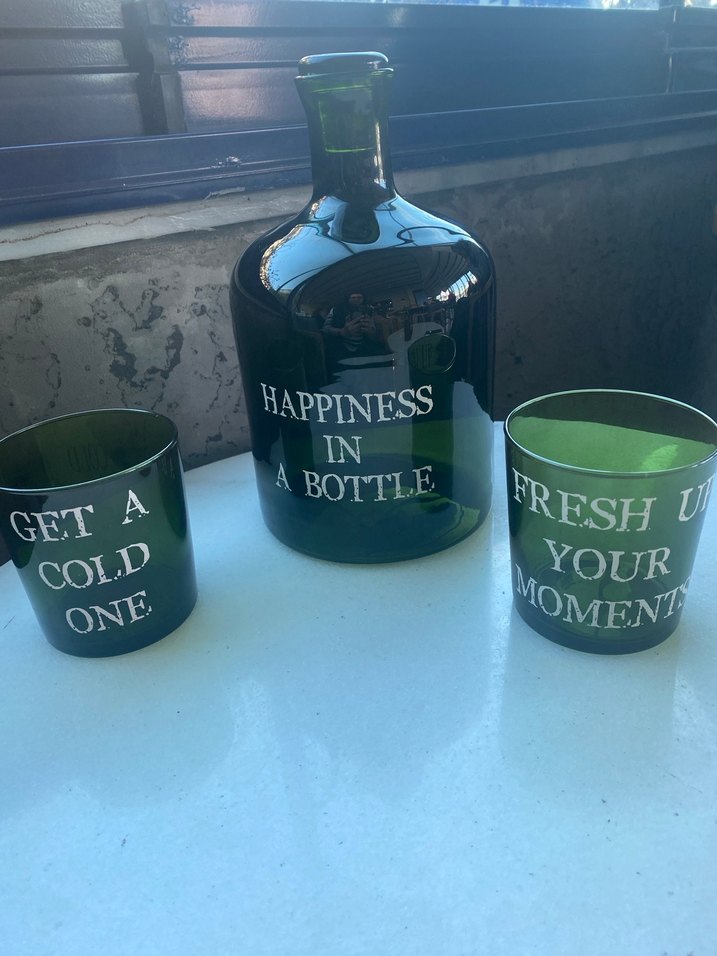 Koyu yeşil cam şişe ve üzeri yazılı iki bardaktan oluşan set. Şişe üzerinde 'Happiness in a bottle', bardaklarda 'Get a cold one' ve 'Fresh up your moment' yazıyor. Sise 1900 ml & bardak 380 ml