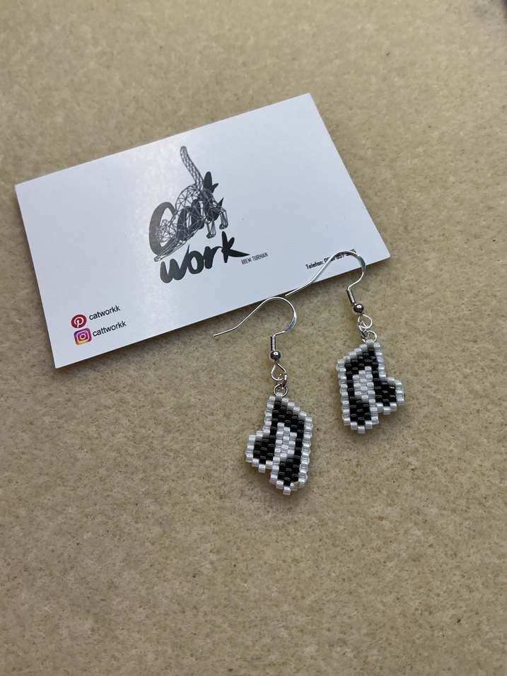 Mini boy kısa boncuk işlemeli, siyah beyaz baskılı müzik notası desenli küpeler. Minimalist rock punk tarzını yansıtır.