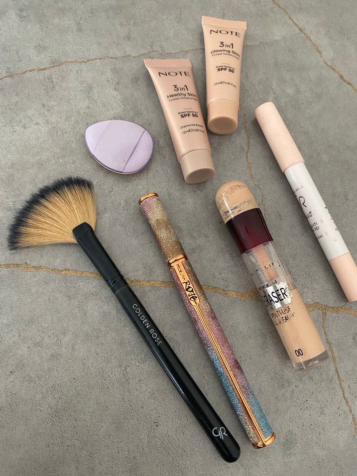 Açıklamayı okuyunuz Note markasının SPF 15 korumalı 3'ü 1 arada fondöten ve kapatıcı ile pastel bej tonlarında makyaj ürünleri seti. Note makyaj bazları bikere kullanılmıştır gölden Rose aydınlatıcı az kullanılmıştır aydınlatıcı fırçası çok fırçam olduğu için satıyorum defosuzdur bitane makyaj pufu 00 numara göz altı kapatıcı az kullanılmış tır siyah göz kalemi bi iki kere denenmiştir sadece makyaj malzemelerinin içinde durduğu için dışı az soyulmustur