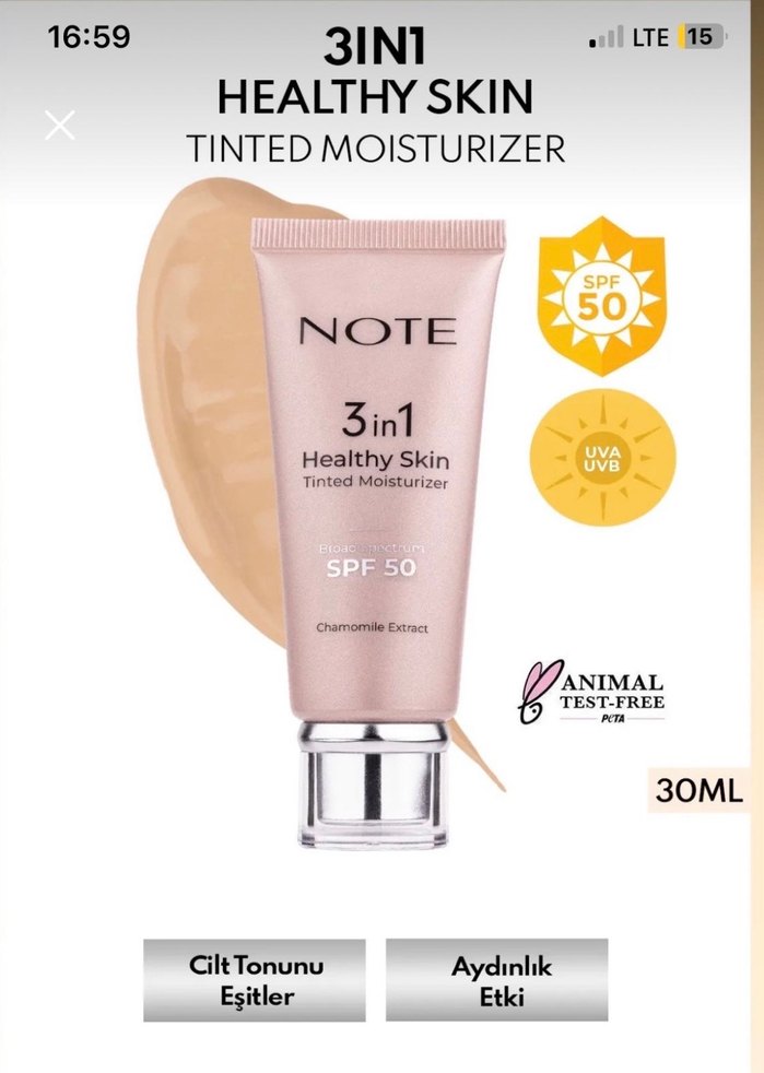 Note 3in1 Healthy Skin BB Krem, SPF 50 koruması ve nemlendirici etkisiyle cilt tonunu eşitler bana tonu uymadı sadece bir defa denendi