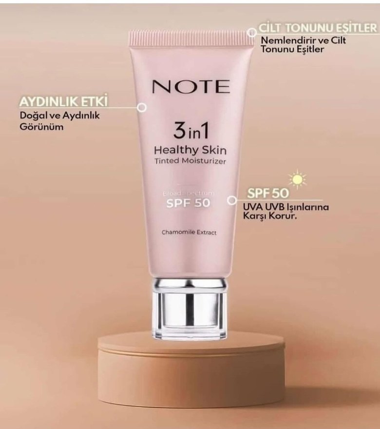 Note 3in1 Healthy Skin BB krem, SPF 50 koruması ile cilt tonunu eşitler, nemlendirir ve UVA/UVB ışınlarına karşı korur. Papatya özü içerir.