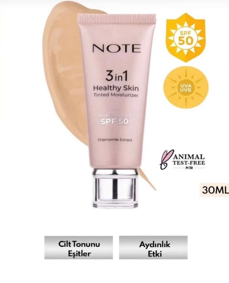 Note 3in1 SPF50 BB krem, cilt tonunu eşitler ve papatya özü ile aydınlık etki sağlar. Hayvanlar üzerinde test edilmemiştir.