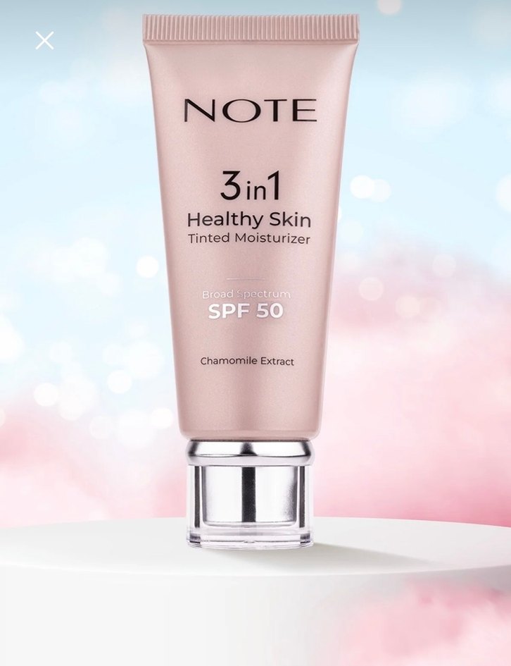 Note 3in1 BB krem, SPF50 koruma ve papatya özü ile sağlıklı cilt için renkli nemlendirici sunar. Pastel bej tonunda.