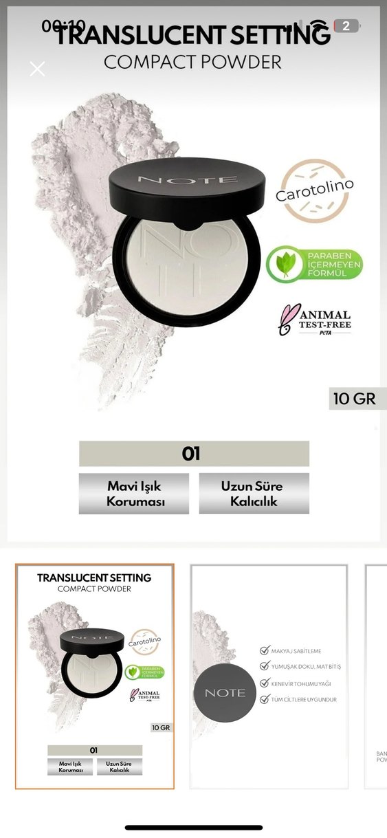 Note Carotolino transparan compact pudra, mavi ışık koruması ve uzun süre kalıcılık sağlar. Yumuşak dokulu, paraben içermez ve hayvanlar üzerinde test edilmemiştir.