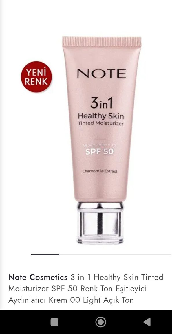 Note Cosmetics 3'ü 1 Arada SPF50 BB krem, papatya özü içerir ve cildi nemlendirip koruyarak parlak bej tonunda kapatıcılık sağlar.