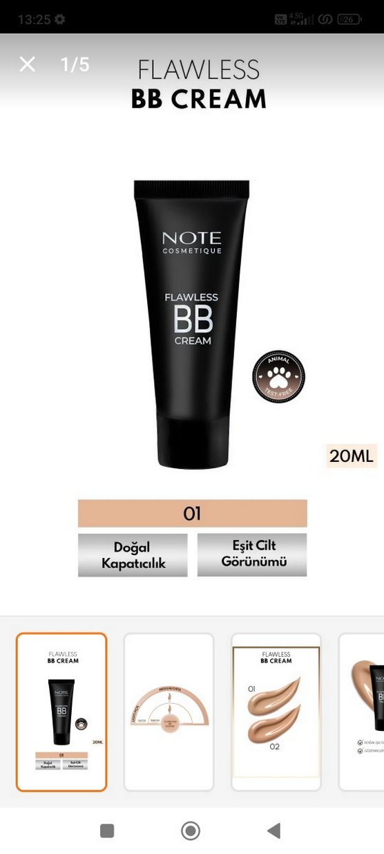 Note Flawless BB Cream siyah ambalajda, doğal kapatıcılık ve eşit cilt görünümü sağlar. 20 ml tüp, günlük kullanım için uygundur.