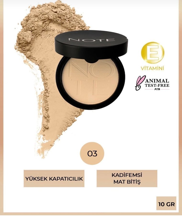 Note pudra 03 bej rengi, yüksek kapatıcılık ve kadifemsi mat bitiş sunar. Vitamin içerir ve hayvanlar üzerinde test edilmemiştir.