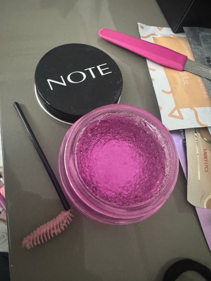 Note markalı parlak pembe renkte makyaj ürünü, aplikatör fırça ve küçük spatula ile birlikte.