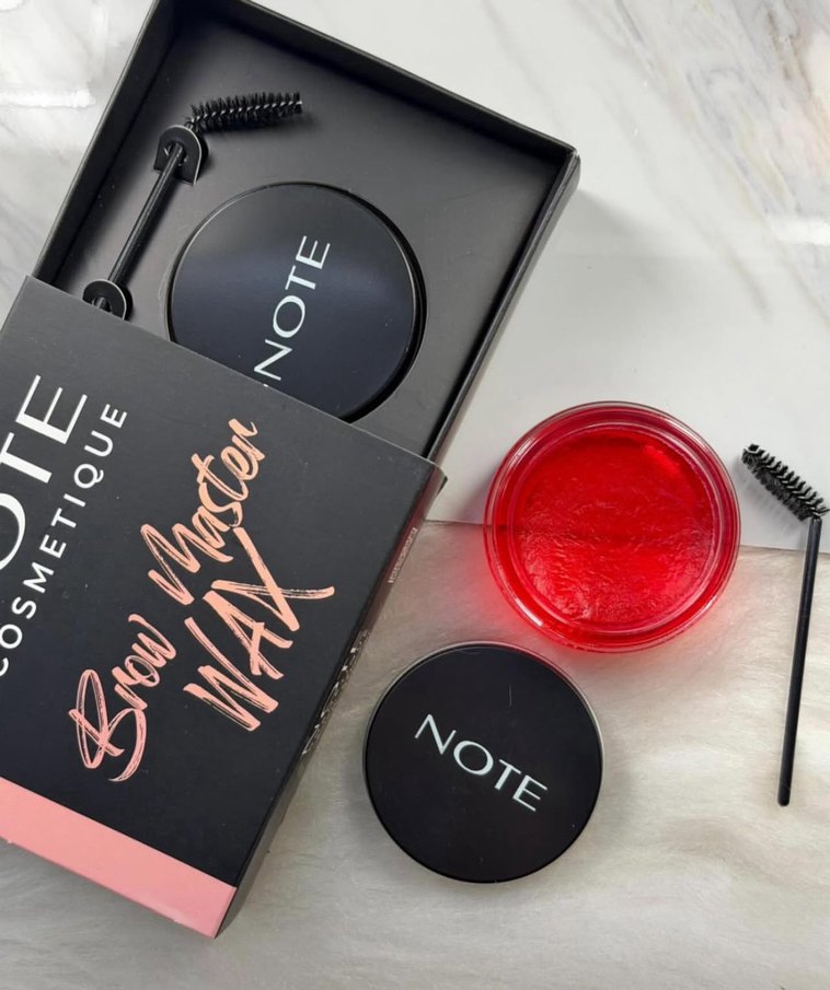 Note marka koyu kırmızı kaş maskarası, fırça aplikatörlü ve kaşları şekillendirip renklendirir. Siyah kompakt kutuda.