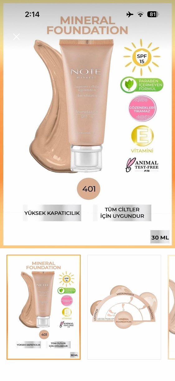 Note Mineral BB Krem, yüksek kapatıcılığa sahip, tüm cilt tipleri için uygundur. E vitamini içerir, paraben ve hayvan testi içermez. 30 ml tüpte, gözenekleri tıkamaz. Saten bitişli yanlış renk almışım hiç kullanmadım sadece tonuna bakmak için açıldı.