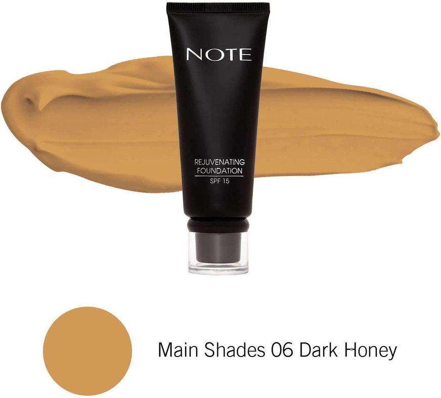 Note Rejuvenating Fondöten SPF 15, 06 Dark H tonunda parlak bej rengiyle cildi canlandırır ve güneş koruması sağlar.