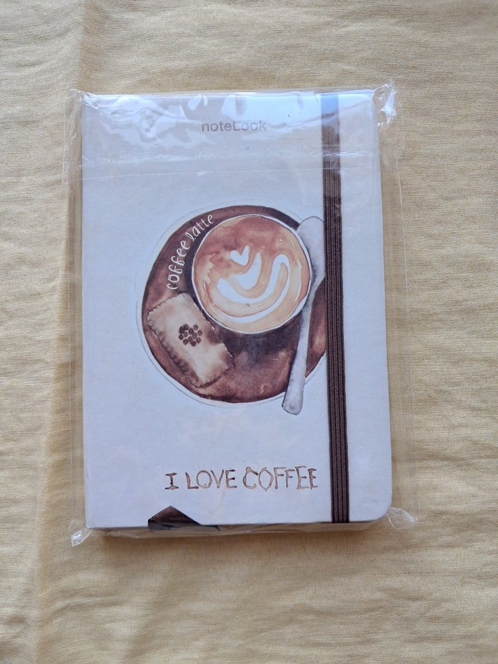 Bej renkli, kahve fincanı ve "I LOVE COFFEE" yazılı, lastikli kapaklı not defteri. ☕