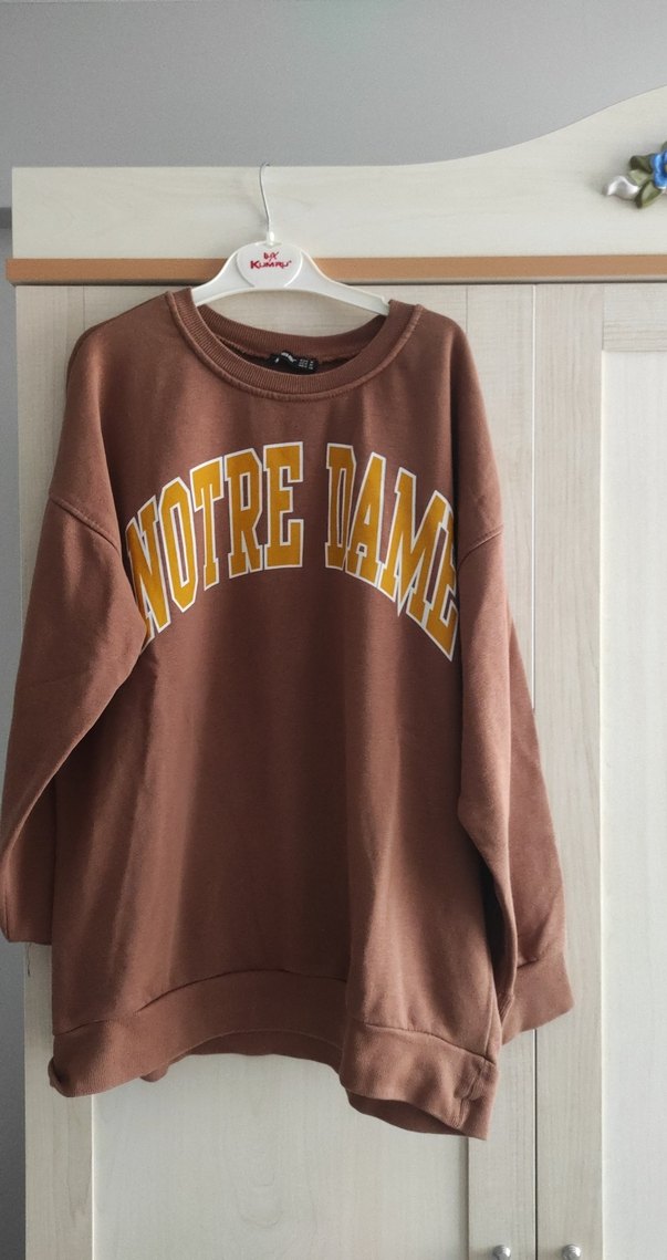 Notre Dame baskılı, uzun kollu, kahverengi sweatshirt. Yumuşak ve rahat kumaştan, günlük kullanıma uygun.