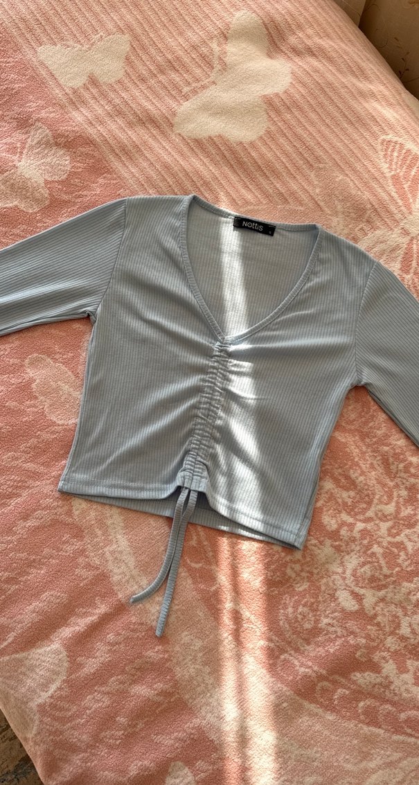 Buz mavisi renkte, yumuşak keten kumaştan yapılmış, V yakalı ve uzun kollu, ön kısmında büzgülü detaylı, normal boyda dar kesim bluz.