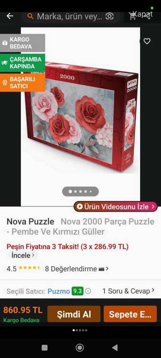 Nova Puzzle'ın 2000 parçalık puzzle'ı, pembe ve kırmızı güllerin canlı görüntüsünü sunar. 8 değerlendirmede 4.5 yıldız almıştır.